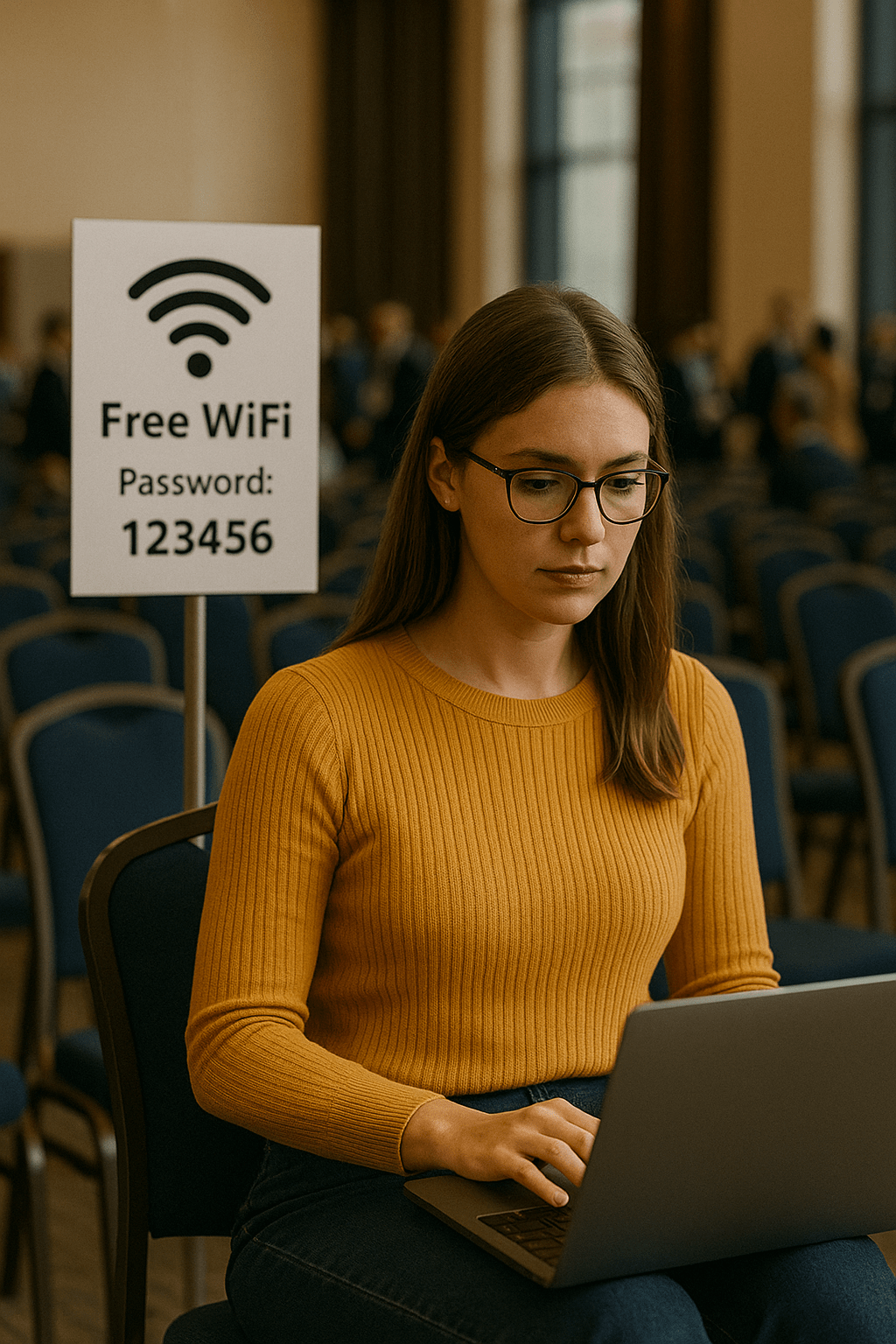 Ut på jobbtur, aldri sur. Konferansehallen er stor, og mobilnettet sliter med å holde følge. Men heldigvis: et trådløst nettverk er tilgjengelig, og passordet er lett å finne – det henger på plakater rundt omkring i lokalet.