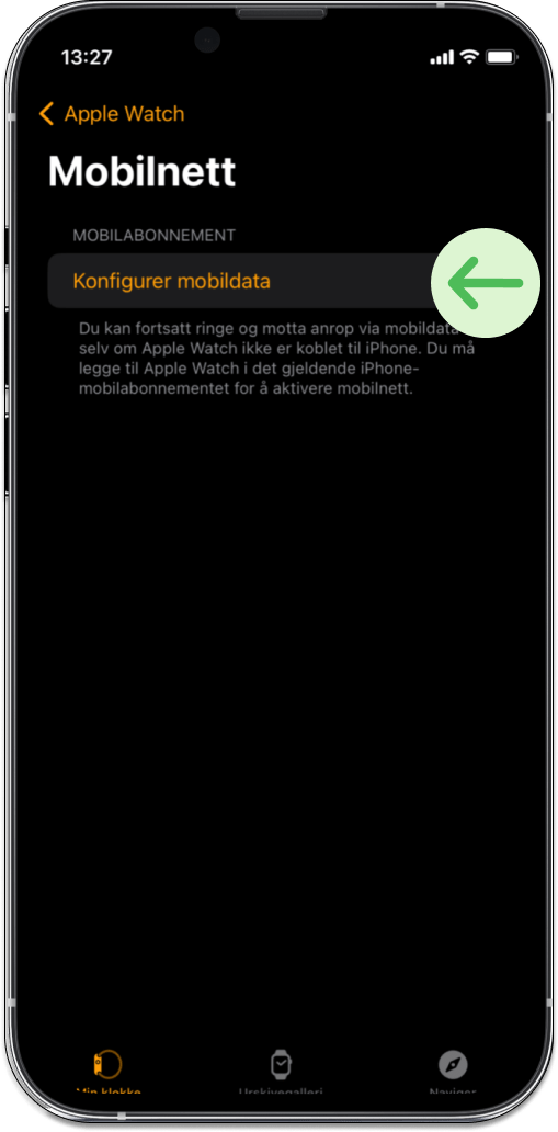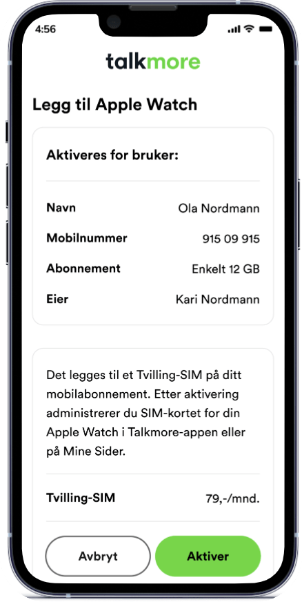 OBS: Siden tvilling er en løpende tjeneste kan du ikke aktivere eSIM til Apple Watch med Talkmore Forhåndsbetalt. Du må først bytte til et abonnement i Talkmore-appen eller Mine Sider før du kan aktivere eSIM på Apple Watch.